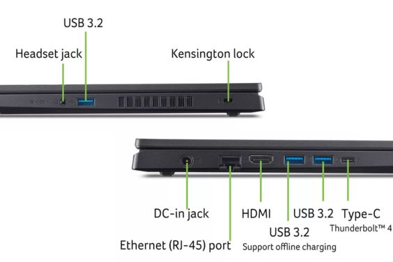 Laptop Acer Nitro V ANV15 51 trang bị đầy đủ các cổng kết nối tiện dụng ở cả hai cạnh, mang lại sự linh hoạt và thuận tiện tối ưu cho người sử dụng. Các cổng kết nối bao gồm: