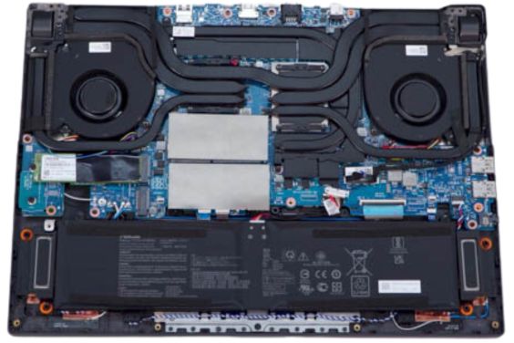 Về khả năng làm mát, laptop này duy trì cấu hình thấp với hiệu quả làm mát êm ái. Hợp chất nhiệt kim loại lỏng giúp tản nhiệt hiệu quả hơn từ CPU, trong khi quạt Arc Flow với 84 cánh thiết kế mới đẩy nhiều không khí hơn và ít nhiễu loạn hơn. Luồng không khí sẽ đi qua tối đa 4 tấm tản nhiệt và cửa gió quạt để thoát nhiệt một cách nhanh chóng. Những cải tiến này cùng với ROG Boost giúp ép xung GPU ở chế độ Turbo, mở ra không gian nhiệt rộng hơn để đạt được xung nhịp GPU cao hơn và ép xung CPU.