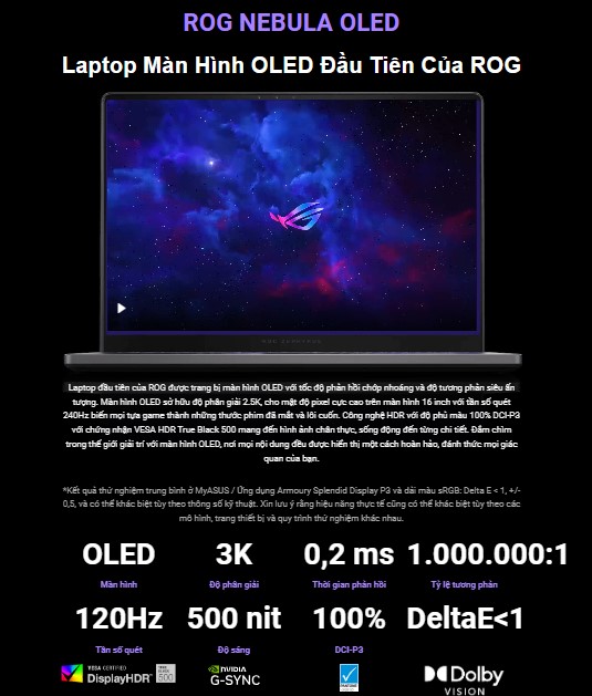 ROG Nebula Display 14-inch 3K (2880 x 1800) OLED 16:10 aspect ratio OLED Glossy display DCI-P3: 100% Refresh Rate: 120Hz Response Time: 0.2ms G-Sync / Adaptive-Sync Pantone Validated MUX Switch + NVIDIA® Advanced Optimus Support Dolby Vision HDR : Yes