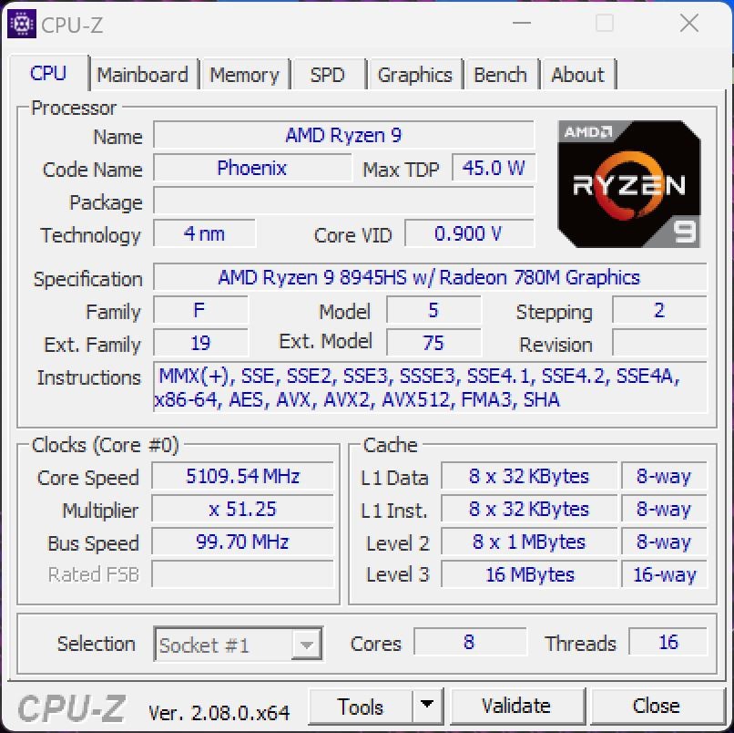 AMD Ryzen™ 7 8845HS (8C / 16T, 3.8 / 5.1GHz, 8MB L2 / 16MB L3)