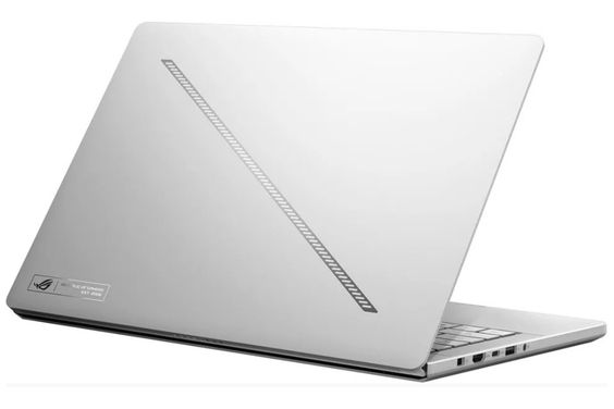 Mặt sau của laptop là thiết kế đường chéo độc đáo, nổi bật trên nền trắng, tạo cảm giác thanh lịch và thời thượng. Một điểm cộng lớn nữa là thân máy cực kỳ nhỏ gọn và nhẹ nhàng. Đây được xem là một trong những mẫu laptop chơi game di động mỏng nhẹ hàng đầu hiện nay, lý tưởng cho cả công việc lẫn giải trí khi di chuyển thường xuyên.