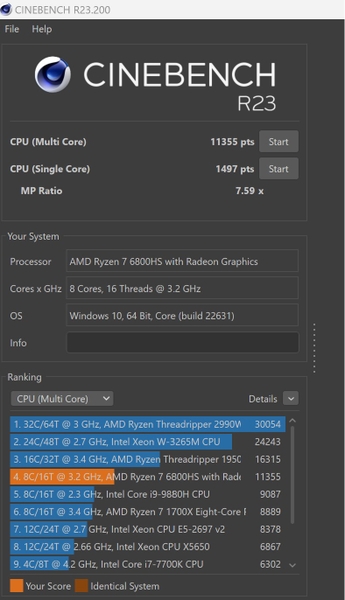 Laptop ASUS ROG Zephyrus G14 2022 GA402R được động viên bởi bộ vi xử lý Ryzen 9 6900HS mạnh mẽ của AMD, với 8 nhân và 16 luồng. Với khả năng xử lý đa nhiệm và thực hiện các công việc nặng mượt mà, con chip này đem đến hiệu suất ấn tượng. Bảng so sánh hiệu năng dưới đây sẽ rõ ràng thể hiện sức mạnh đáng kinh ngạc của bộ vi xử lý này.