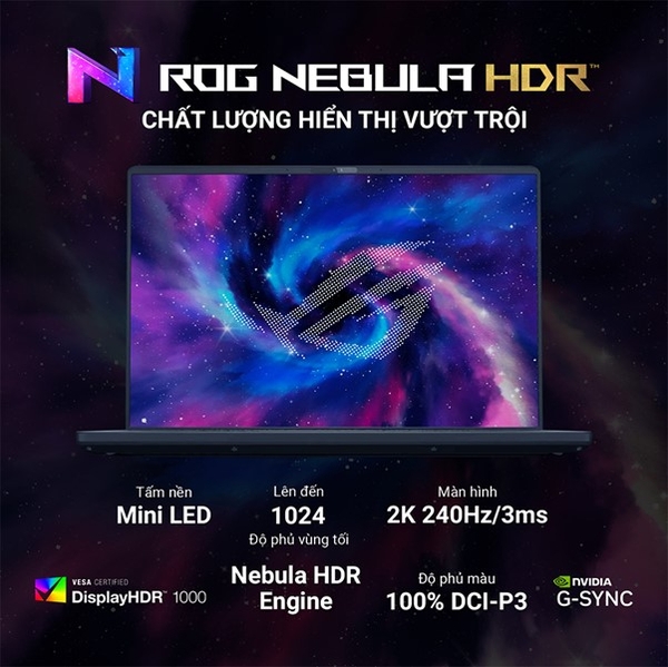 - Màn hình ROG Nebula HDR Display 16-inch QHD+ Mini LED, có độ phân giải 2560 x 1600, refresh rate 240Hz, response time 3ms, hỗ trợ G-Sync và Dolby Vision HDR.