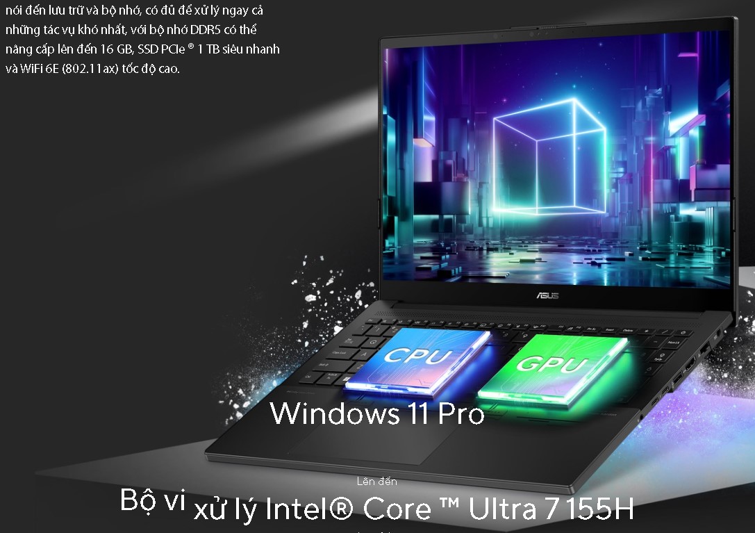 - Hiệu suất mạnh mẽ: Trang bị chip Ultra 7 155H, card đồ họa RTX™ 3050 tích hợp, hỗ trợ đồ họa cao cấp và chơi game mượt mà.