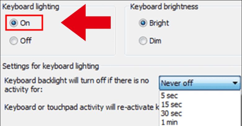 Bước 5: Chọn “On” để bật đèn bàn phím hoặc “Off” để tắt, sau đó nhấn “OK” để lưu thay đổi.
