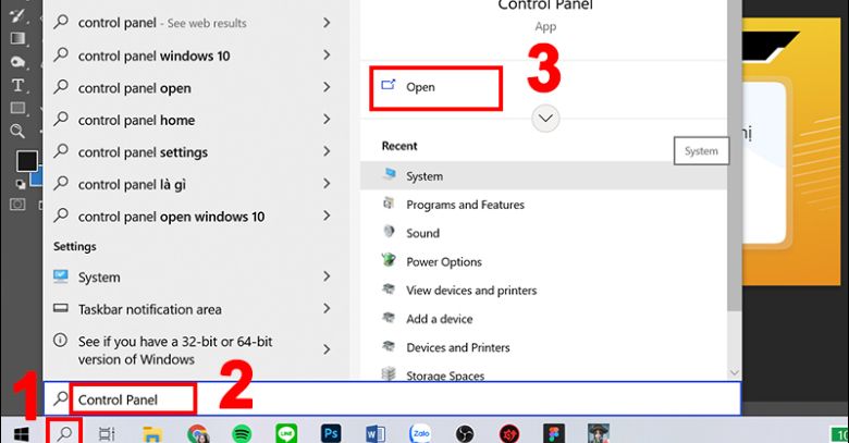 Bước 1: Tại thanh Taskbar, nhập “Control Panel” vào ô tìm kiếm và chọn “Open”.