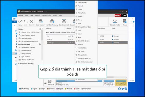 - Gộp phân vùng (Merge Partition): Bạn có thể hợp nhất hai phân vùng liền kề thành một để có không gian lưu trữ lớn hơn mà không lo mất mát dữ liệu.
