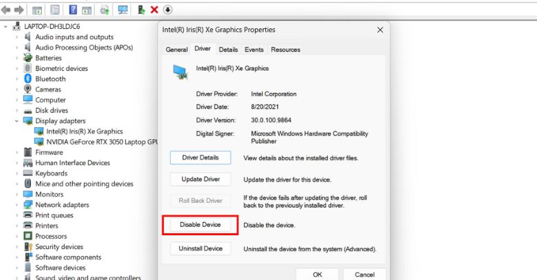 - Chuyển sang tab Driver và nhấp vào Disable Device, sau đó xác nhận bằng cách nhấn Yes.