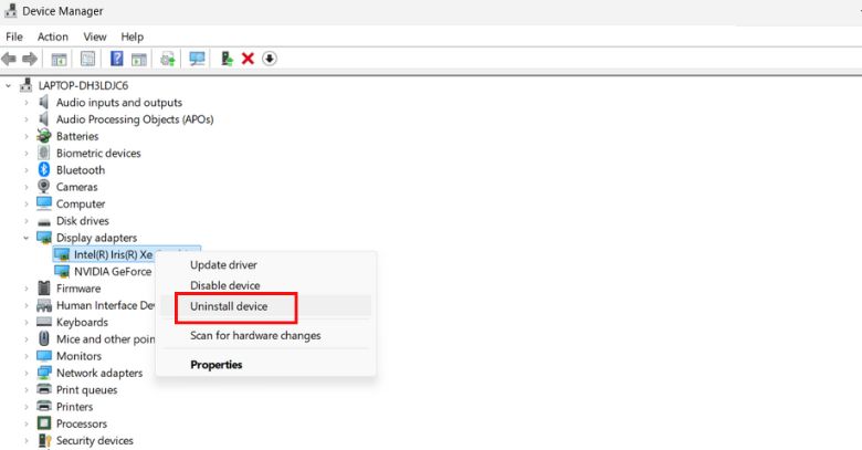 - Nhấp chuột phải vào driver card đồ họa và chọn Uninstall device từ menu ngữ cảnh.