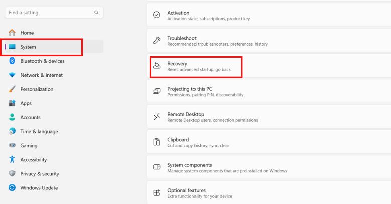 - Đi đến mục Recovery: Tại trang System, nhấp vào Recovery. Trong menu Recovery, tìm tùy chọn Reset this PC và nhấn vào nút Reset PC.