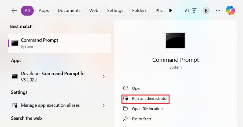 Bước 2: Nhập "Command Prompt", sau đó nhấp chuột phải vào kết quả và chọn "Run as administrator".