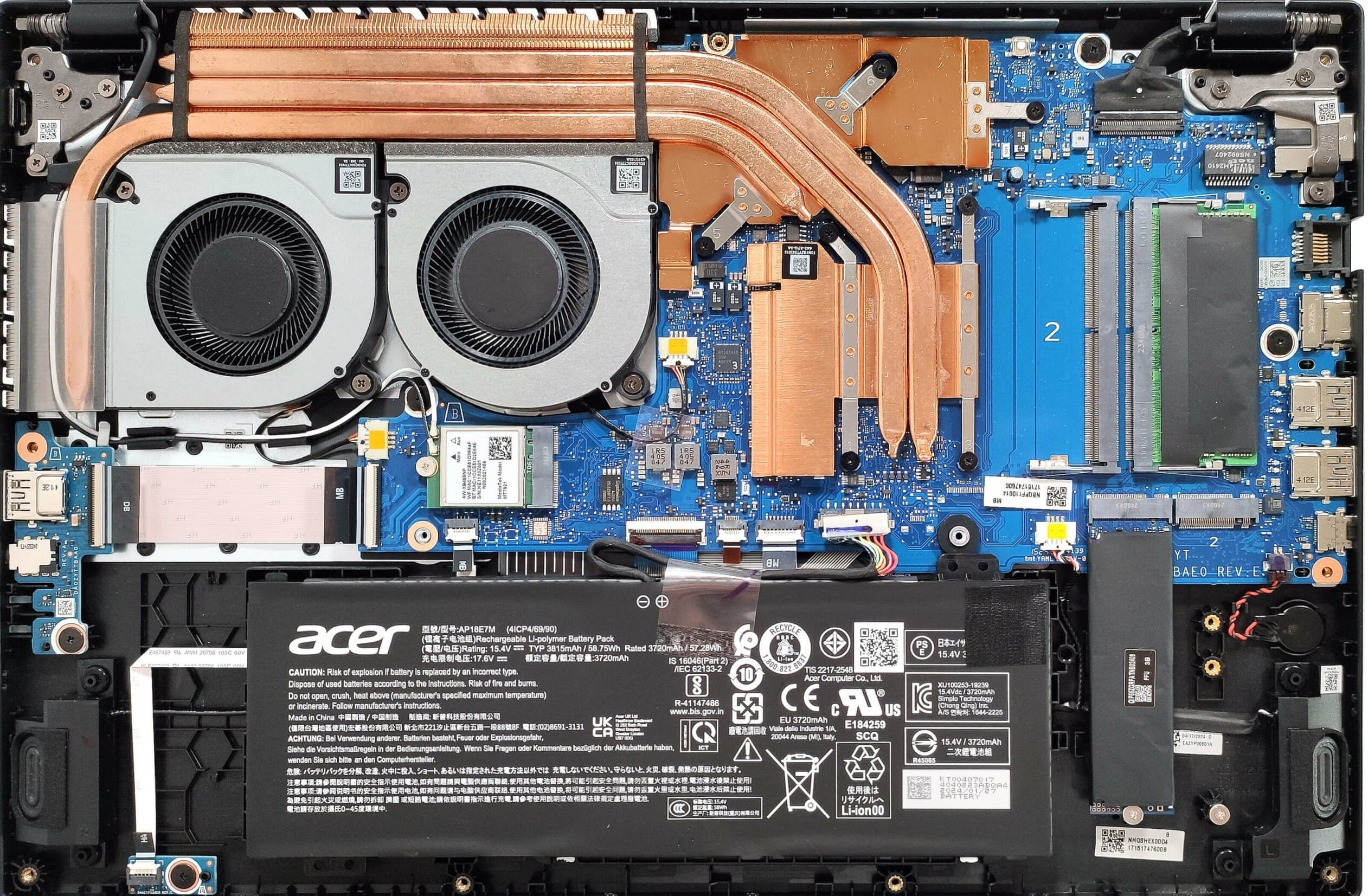Hình ảnh nội thất cho thấy Acer Nitro V được trang bị hệ thống tản nhiệt khá tốt trong phân khúc với 2 quạt lớn kết hợp nhiều ống đồng dẫn nhiệt phủ rộng CPU và GPU, giúp tối ưu khả năng làm mát khi chơi game hoặc chạy tác vụ nặng. Bên cạnh đó, máy có 2 khe RAM dễ nâng cấp, 1 khe SSD M.2 cùng không gian bố trí linh kiện gọn gàng, thuận tiện cho việc vệ sinh và nâng cấp về lâu dài. Viên pin dung lượng 57Wh được đặt phía dưới, trong khi các linh kiện như Wi-Fi, loa và cổng kết nối được bố trí hợp lý, đảm bảo sự cân bằng giữa hiệu năng và khả năng tản nhiệt.