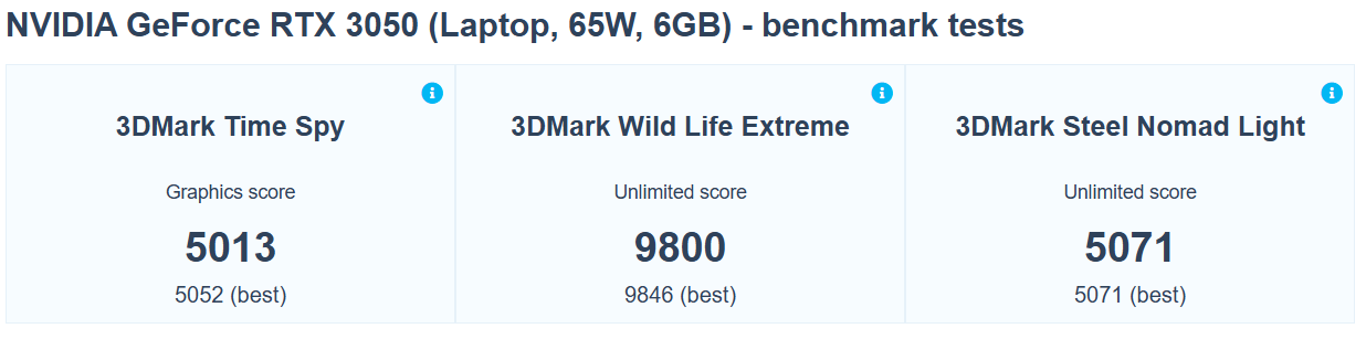 Ảnh benchmark cho thấy RTX 3050 Laptop (65W, 6GB) đạt khoảng 5.013 điểm 3DMark Time Spy, gần 9.800 điểm ở Wild Life Extreme và hơn 5.000 điểm trong Steel Nomad Light, phản ánh hiệu năng ở mức tầm trung. Với kết quả này, GPU vẫn đủ sức xử lý tốt các tựa game eSports và nhiều game AAA ở thiết lập Medium, nhưng sẽ bắt đầu hạn chế khi chơi các game nặng hoặc yêu cầu đồ họa cao trong năm 2026.