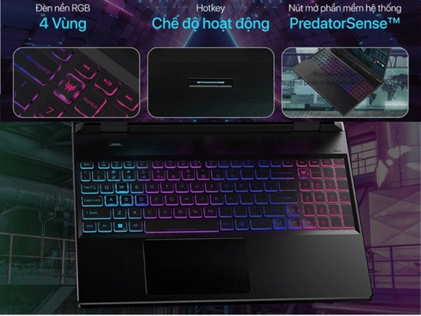 - Đèn nền RGB và tùy chỉnh ánh sáng: Đèn nền RGB từng phím và ánh sáng trên cổng kết nối, khe tản nhiệt tạo không gian độc đáo và cho phép tùy chỉnh theo sở thích cá nhân.