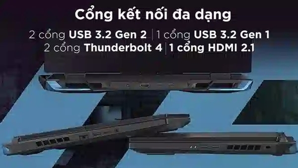 Acer Predator Helios Neo cung cấp một loạt các cổng kết nối đa dạng, bao gồm cổng USB-A 3.2 Gen2, hai cổng USB-C hỗ trợ giao thức Thunderbolt 4, cổng HDMI 2.1, cổng mini-DisplayPort, cổng LAN RJ-45, cổng tai nghe 3.5mm và cả khe cắm thẻ nhớ microSD,...