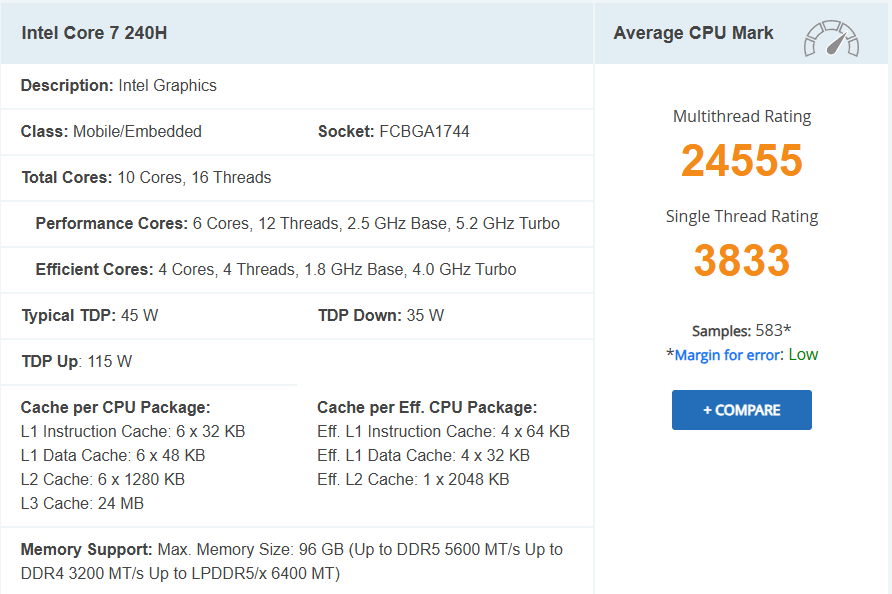 Test CPU Intel Core 7 240H trên benchmark