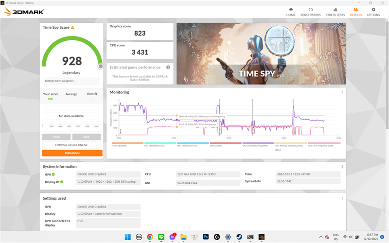 Trong bài test 3DMark Time Spy, GPU Intel Iris Xe đạt khoảng 900+ điểm, phản ánh đúng khả năng xử lý đồ họa ở mức cơ bản, phù hợp eSports và các tác vụ nhẹ.