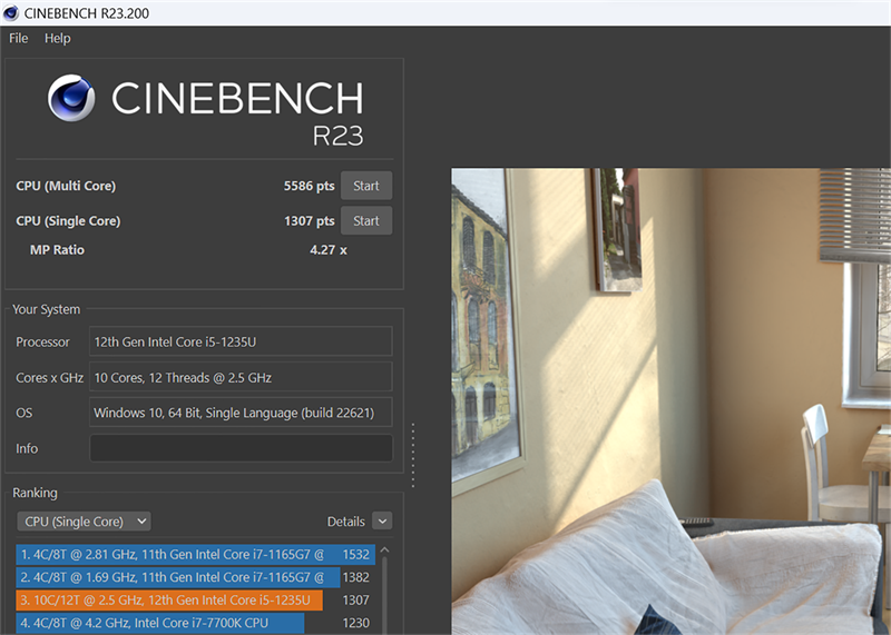 Hiệu năng thực tế được thể hiện qua bài test Cinebench R23 với khoảng 5.500+ điểm đa nhân và hơn 1.300 điểm đơn nhân, cho thấy i5-1240P hoàn toàn đáp ứng tốt nhu cầu làm việc đa nhiệm, học tập và xử lý tác vụ hàng ngày.