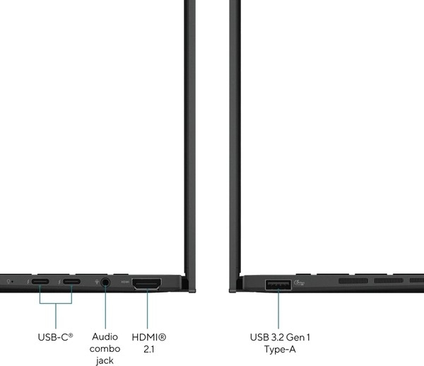 - Máy có nhiều cổng kết nối bao gồm Thunderbolt™ 4, HDMI 2.1, USB 3.2 Gen 1 Type-A, cùng Wi-Fi 6E và Bluetooth® 5.3, mang lại sự linh hoạt trong việc kết nối với các thiết bị và mạng.