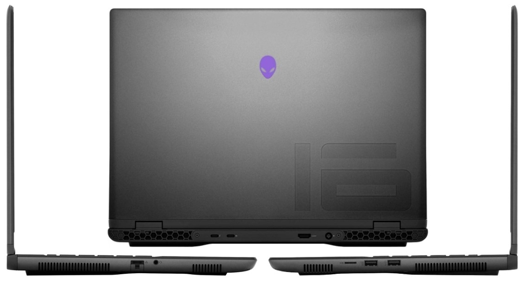 Hầu hết các sản phẩm trong dòng laptop Dell Alienware Series đều mang dáng vẻ mạnh mẽ, đậm chất tương lai, và kiểu thiết kế này đã trở thành biểu tượng của thời đại. Không ngoại lệ, Alienware M16 R2 tiếp tục theo đuổi xu hướng này với một diện mạo lấy cảm hứng từ vũ trụ, tông màu Đen Huyền Bí (Dark Metallic Moon) cùng với các chi tiết đặc trưng như khe gió tổ ong và logo Người ngoài hành tinh phát sáng.