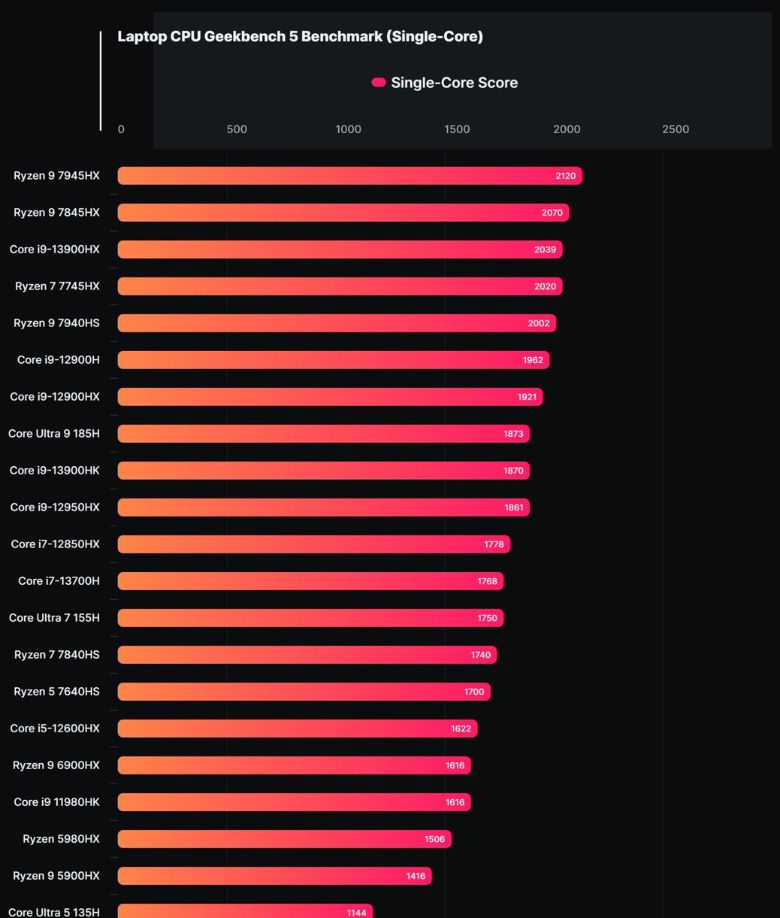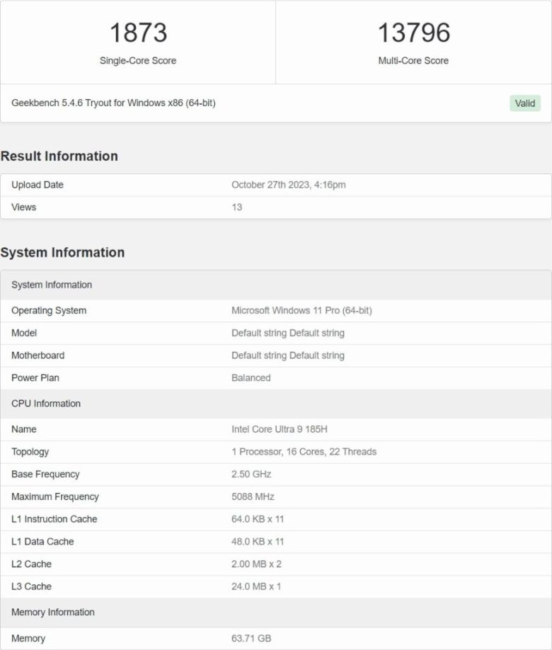 Trong bài kiểm tra Geekbench 5, Intel Core Ultra 9 185H đạt 1.873 điểm đơn nhân và 13.796 điểm đa nhân, vượt qua i9-12950HX, vốn chỉ có 8 lõi P và 8 lõi E với TDP lên đến 157W (PL2).
