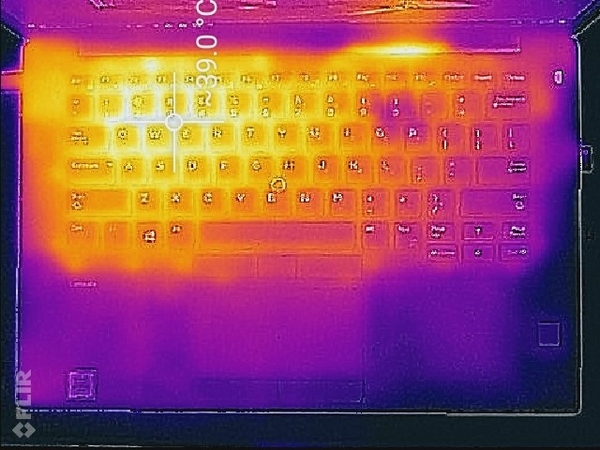 Về nhiệt độ, khi máy hoạt động, nhiệt độ bề mặt trung bình là 27 độ C. Tuy nhiên, ở hiệu suất tối đa, nhiệt độ có thể lên đến 39 độ C ở một số vùng trên máy.