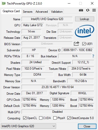HP Elitebook 840 G5 còn sử dụng GPU tích hợp Intel UHD Graphics 620. Đây là một card đồ họa tích hợp, phù hợp cho các công việc văn phòng, duyệt web và cơ bản hơn là tác vụ đòi hỏi về đồ họa. Mặc dù không phải là một card đồ họa rời mạnh mẽ, nhưng với các công việc thông thường, nó cung cấp hiệu suất đáng tin cậy.