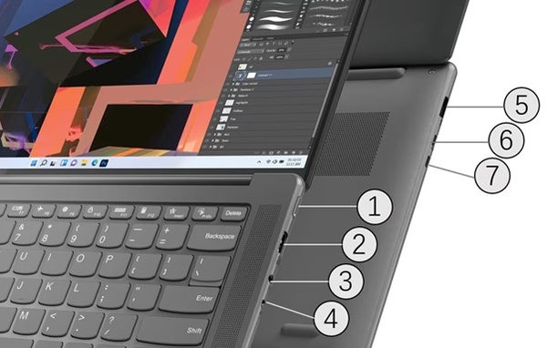 Lenovo Slim 7 ProX được trang bị một loạt các cổng kết nối, bao gồm hai cổng USB Type-C, hai cổng USB Type-A, và jack cắm 3.5mm. Đây là một lựa chọn hợp lý cho một chiếc Ultrabook có thiết kế siêu mỏng nhẹ như Slim 7 ProX. Số lượng cổng kết nối này có vẻ đủ để đáp ứng nhu cầu sử dụng hàng ngày.