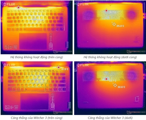 Tính đến nhiệt độ bề mặt, có thể thấy nó có thể tăng lên đáng kể do sự kết hợp giữa cấu hình mỏng, CPU dòng H và GPU GeForce RTX rời. Trong điều kiện chịu tải, các điểm nóng ở mặt trên và mặt dưới có thể đạt đến 42 độ C và 50 độ C tương ứng. Các điểm nóng này chủ yếu tập trung ở trung tâm bàn phím và phía sau máy, nơi lòng bàn tay và da khó chạm vào trong thời gian dài.
