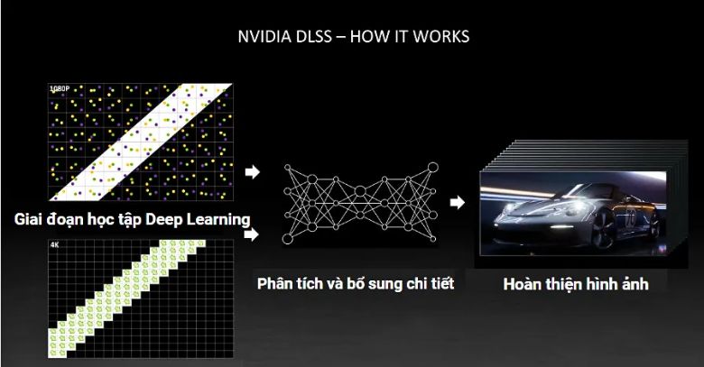 - Giai đoạn học tập Deep Learning: NVIDIA sử dụng một kho dữ liệu khổng lồ bao gồm các trò chơi video và hình ảnh chất lượng cao để huấn luyện mạng nơ-ron sâu (Deep Neural Network). Đây là nền tảng cho quá trình xử lý tiếp theo.