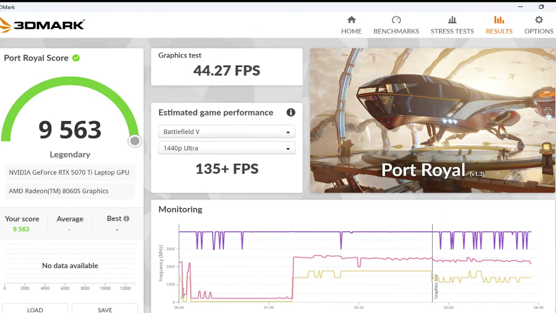 Trong các bài test thực tế bằng 3DMark, RTX 5070 Ti trên XG Mobile đạt khoảng 9.563 điểm Port Royal và 13.507 điểm Time Spy, thuộc nhóm hiệu năng cao cấp trong phân khúc GPU laptop. Những con số này không chỉ mang tính tham khảo mà phản ánh rõ khả năng chiến game thực tế: chơi mượt AAA ở 2K, bật Ray Tracing vẫn giữ FPS ổn định, thậm chí nhiều tựa game có thể vượt mốc 100 FPS.