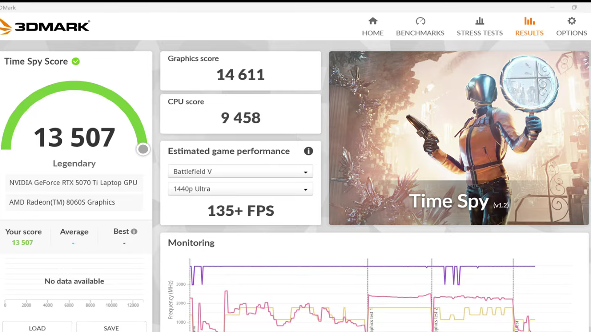 RTX 5070 Ti đạt ~13,507 điểm Time Spy – hiệu năng tổng thể rất mạnh, dư sức chiến game 2K