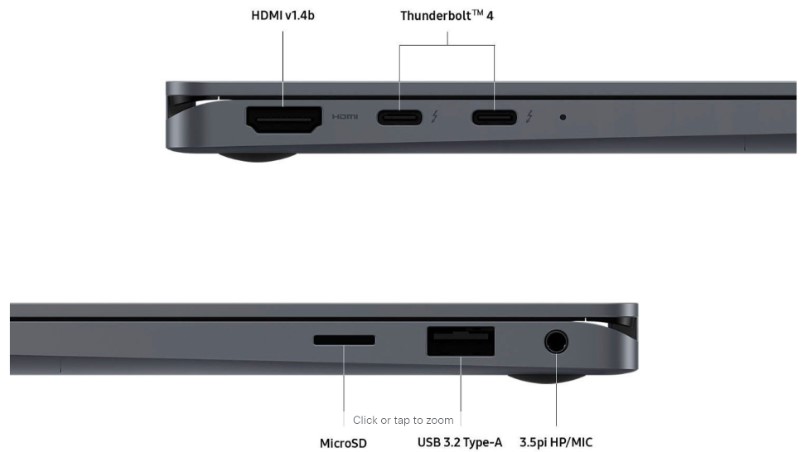 - Máy có 2 cổng Thunderbolt™ 4, 1 cổng HDMI 1.4, 1 cổng USB-A 3.2, 1 khe cắm MicroSD, và 1 cổng combo tai nghe/micro.
