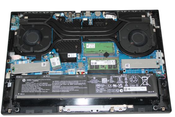 Về mặt thiết kế, HP OMEN 16 u1023dx vẫn giữ nguyên kiểu dáng với khung máy chắc chắn và bề mặt nhẵn như phiên bản trước. Nắp máy bằng nhựa tạo nên sự tương phản với phần đế bằng nhôm. Khi tháo nắp dưới, bạn sẽ thấy được pin và các linh kiện phần cứng khác.
