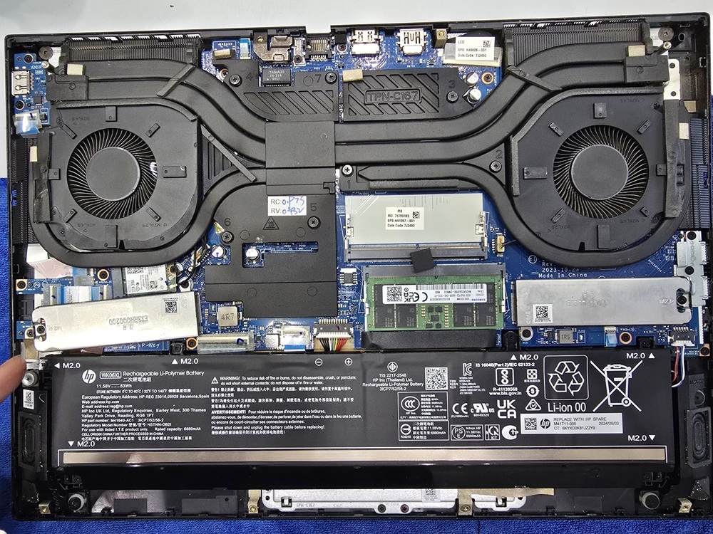Về mặt thiết kế, HP OMEN 16 vẫn giữ nguyên kiểu dáng với khung máy chắc chắn và bề mặt nhẵn như phiên bản trước. Nắp máy bằng nhựa tạo nên sự tương phản với phần đế bằng nhôm. Khi tháo nắp dưới, bạn sẽ thấy được pin và các linh kiện phần cứng khác.