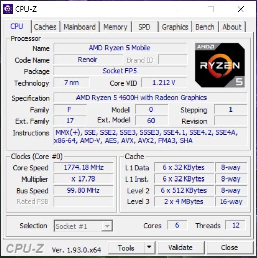 AMD Ryzen 5-4600H 6 core 12 Threads, Up to 4.0GHz |