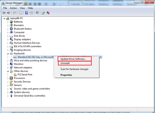 Sau đó, trong cửa sổ Device Manager mà bạn vừa mở, thao tác bấm chọn mục Keyboards, tiếp theo là người dùng ấn chuột phải để vào tùy chọn Update Driver Software hoặc là gỡ bỏ driver bằng cách nhấn Uninstall.
