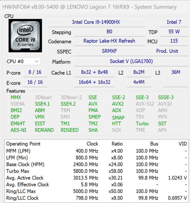 Intel® Core™ i9-14900HX, 24C (8P + 16E) / 32T, P-core 2.2 / 5.8GHz, E-core 1.6 / 4.1GHz, 36MB |