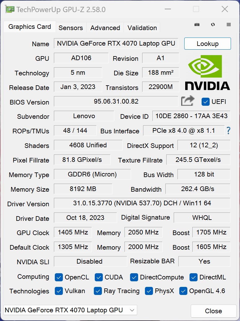 Sự kết hợp với card đồ họa RTX 4070 8GB mang lại hiệu suất đồ họa tuyệt vời, không chỉ đáp ứng mượt mà cho các ứng dụng đồ họa và game nặng, mà còn được hỗ trợ bởi trí tuệ nhân tạo AI, giúp tối ưu hóa trải nghiệm người dùng và tăng cường hiệu suất làm việc.