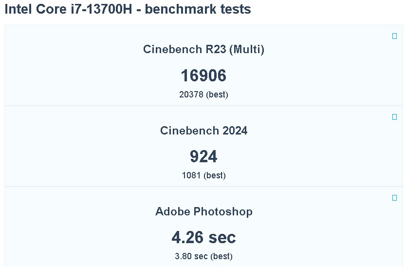 Intel® Core™ i7-13700H, 14C (6P + 8E) / 20T, P-core 2.4 / 5.0GHz, E-core 1.8 / 3.7GHz, 24MB |