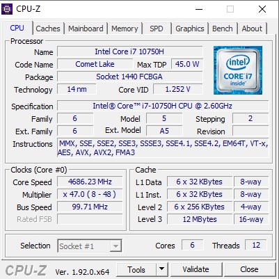 Intel Core i7 10750H 2.60 GHz Turbo 5.0 GHz 6 Core 12 Threads |
