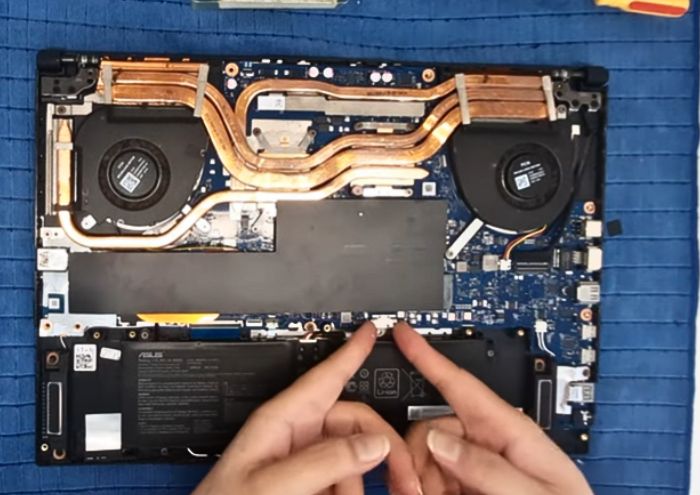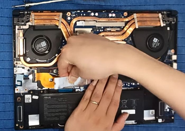 Bước 3: Ngắt kết nối pin: Việc này ngăn chặn dòng điện lưu thông trong máy, giảm nguy cơ chập điện, hỏng hóc linh kiện, hoặc gây sốc điện cho người thực hiện. Thao tác này giúp bảo vệ các thành phần điện tử nhạy cảm khỏi hư hỏng trong quá trình lắp đặt RAM mới.