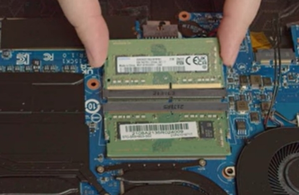Với RAM mới, hãy chắc chắn rằng các khóa trên hai bên module RAM đang mở ra. Chèn module RAM mới vào khe cắm một cách cẩn thận và đúng hướng. Áp lực nhẹ xuống đến khi các khóa khóa module RAM vào vị trí.