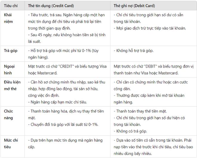 Bảng phân biệt thẻ tín dụng và thẻ ghi nợ