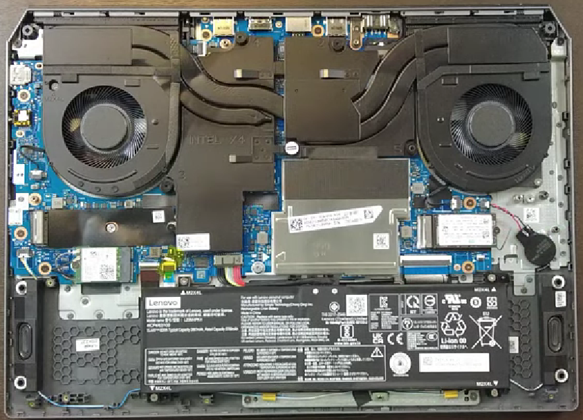 Bên trong Lenovo LOQ 15IRX10 là hệ thống tản nhiệt ColdFront với quạt kép và ống đồng, cùng pin 60Wh, khe RAM DDR5 và ổ SSD PCIe 4.0 NVMe được bố trí khoa học, thuận tiện nâng cấp và đảm bảo hiệu năng ổn định khi sử dụng lâu dài.