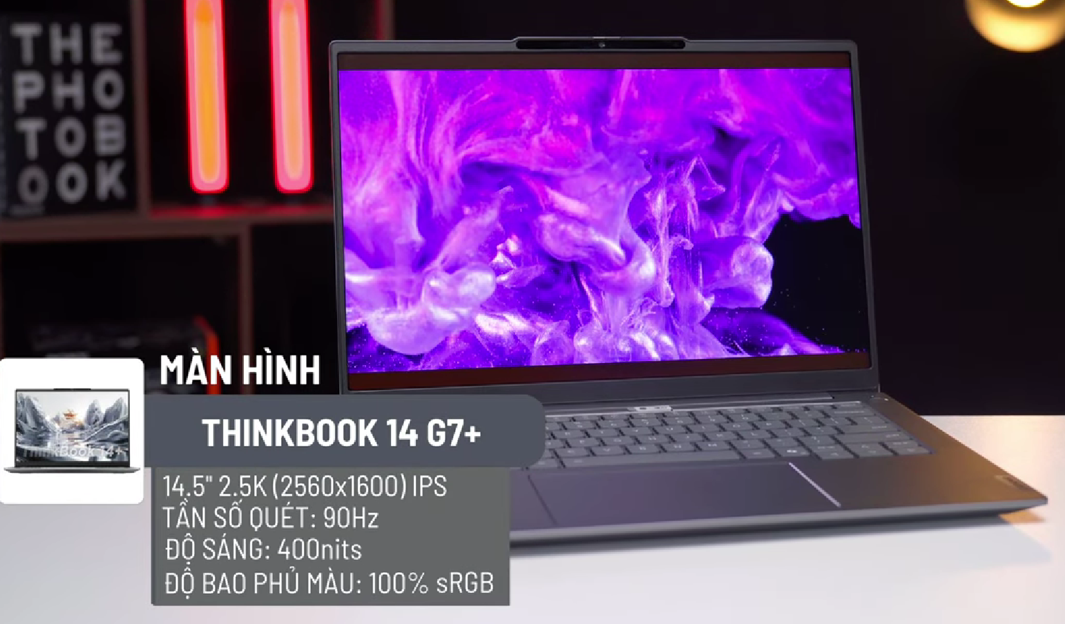 ThinkBook 14 G7+ 2025 sở hữu màn hình 14.5 inch độ phân giải 2.5K, tấm nền IPS, tỷ lệ 16:10, độ sáng 400 nits và độ phủ màu 100% sRGB. Tần số quét 90Hz giúp thao tác cuộn, kéo nội dung mượt hơn rõ rệt so với màn hình 60Hz truyền thống. Trong quá trình làm việc dài giờ, màn hình cho cảm giác dễ chịu, màu sắc chính xác, rất phù hợp cho công việc sáng tạo và xử lý nội dung.